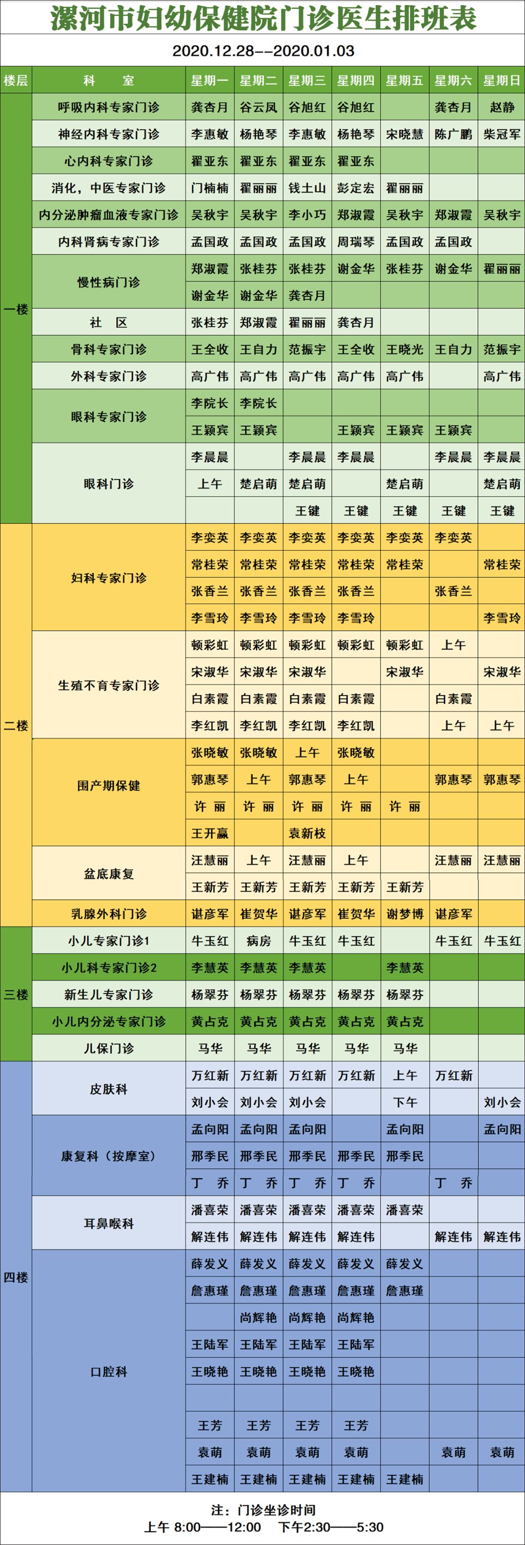 【便民】漯河市妇幼保健院12.28——1.3门诊坐诊时间表