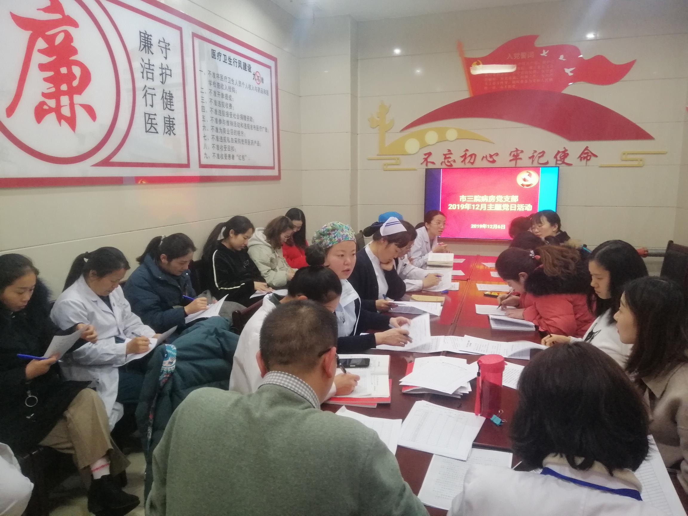 12月6日,漯河市三院组织各支部开展了12月份“主题党日”活动。一是集中学习。各支部带领党员集体学习了习近平总书记在全面深化改革委员会第十一次会议上的重要讲话和省委十届十次全会精神、《党的十九届四中<决定>学习辅导百问》以及《宪法》的有关内容。二是召开专题组织生活会。在专题组织生活会上,每个党员结合自身岗位实际,对照主题教育的要求,认真检视查找了自身的差距和不足,党支部对党员自评和互评情况进行了总结讲评。最后,党支部开展了民主评议党员和党支部分类定级工作。妇幼支部还开展了主题为《牢记党的使命》专题党课。