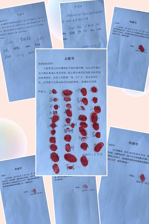 “我志愿投入到新型冠状病毒的防控、诊疗工作第一线,与广大一线同仁一道,赢得这场疫情攻坚战的胜利……”面对急难险重的疫情任务,市三院众医务人员甘当迎风而战的逆行者。仅半天时间,就有60余名医务人员主动请战。一份份言辞恳切的请战书递进了院党委办公室,众多党员干部、医务人员在请战书上庄严地签上了自己的名字、摁上了鲜红的手印。一篇篇摁满红手印的请战书,道出了医务人员的医者仁心和使命担当,也展现了新时代共产党人不畏艰险的精神。