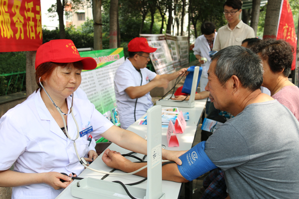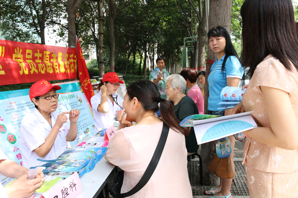 七一前夕,为纪念中国共产党成立94周年,进一步践行“三严三实”活动,继承和发扬党的优良传统,市三院于6月26日上午9点,在工会主席王晓丽的带领下抽调妇产科主任柴喜荣、口腔科主任薛发义、肾病科主任孟国正、内科副主任龚杏月四位资深主任医师在院门口开展义诊咨询服务活动,同时近十名青年党员志愿者也积极融入此次活动。